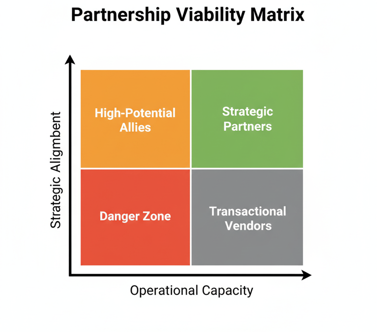 The Partnership Viability Matrix is a simple 2x2 framework I use to diagnose any potential partnership. It replaces gut feeling with strategic clarity to simply filter out what doesn’t match your goals and needs.